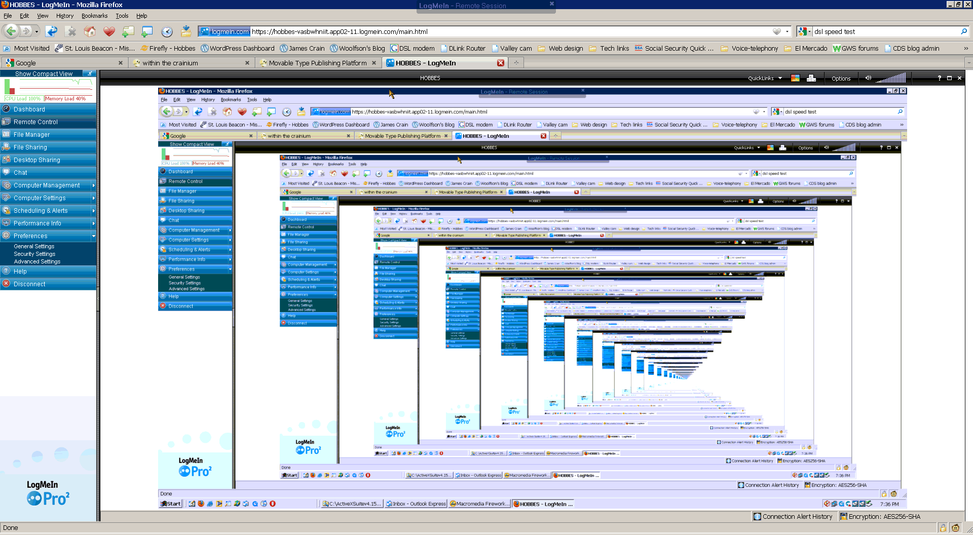 So I’ve been spreading the word about LogMeIn and my friends like it too. One day a friend and I were fooling around with it and got this great infinite series of desktops when I brought up a LogMeIn session on the machine I was working at. (You can do that, as pointless as it is.) This is LogMeIn running in Firefox using its plug-in.