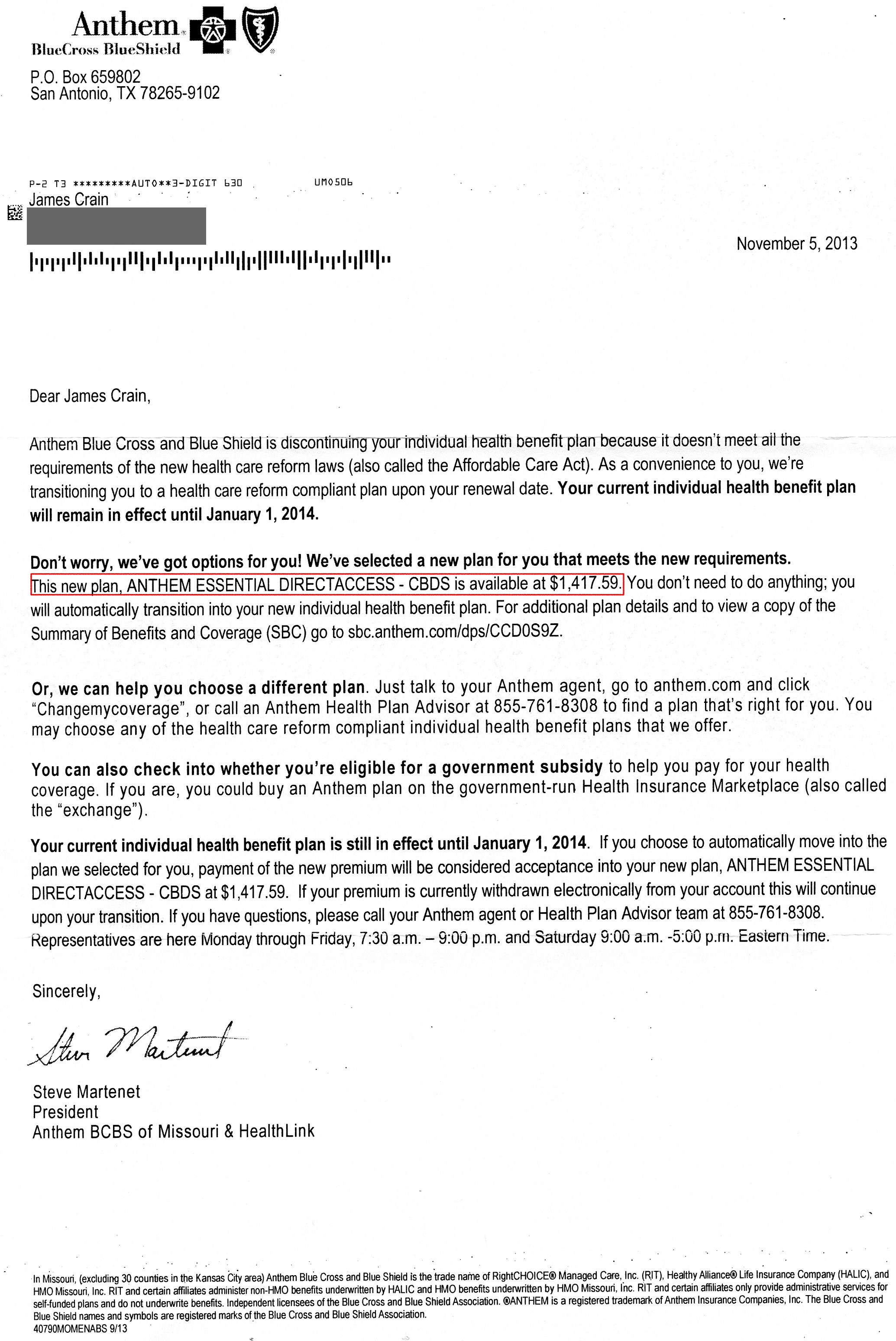 Like many other people, we got a cancellation letter from our health insurance carrier. It contains the same news people all over the country are getting.